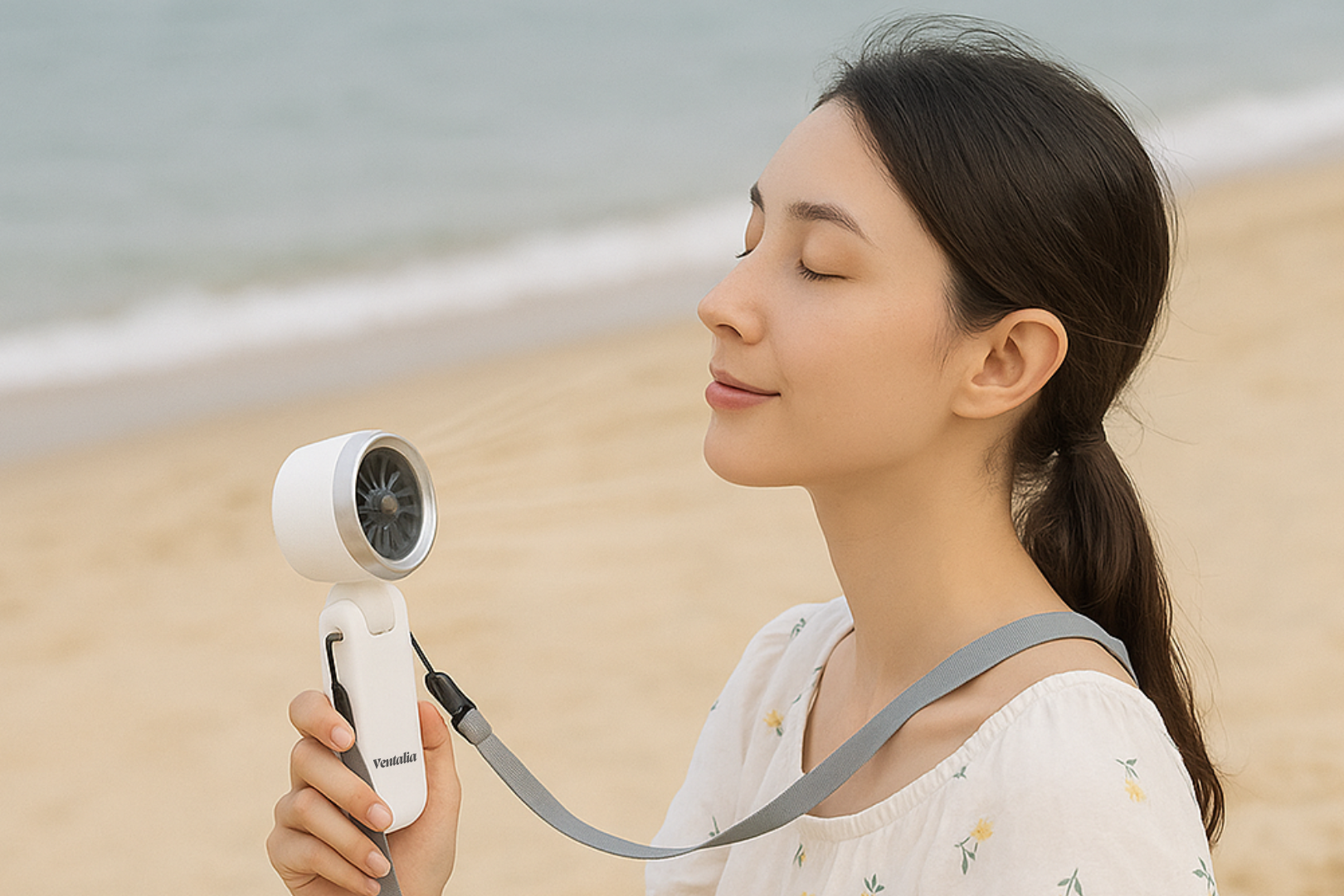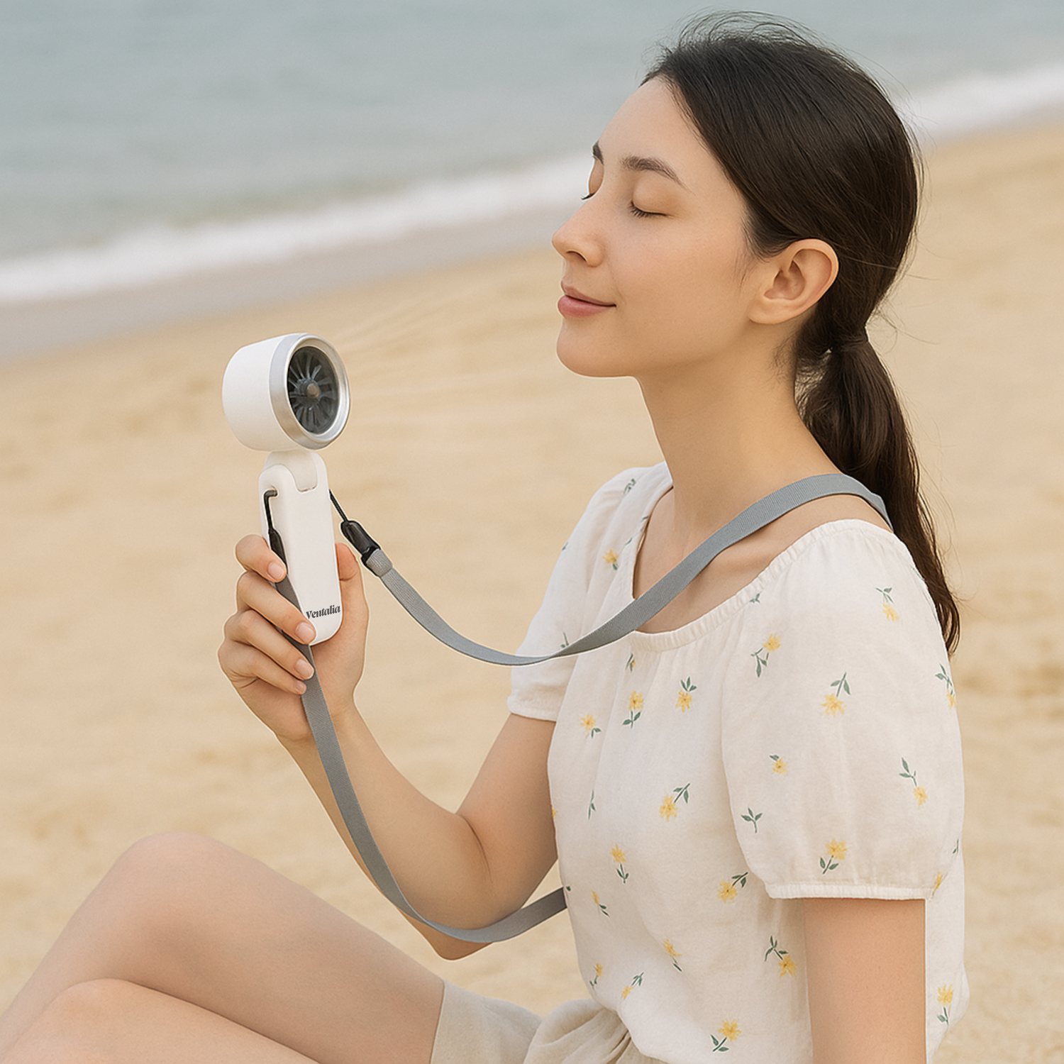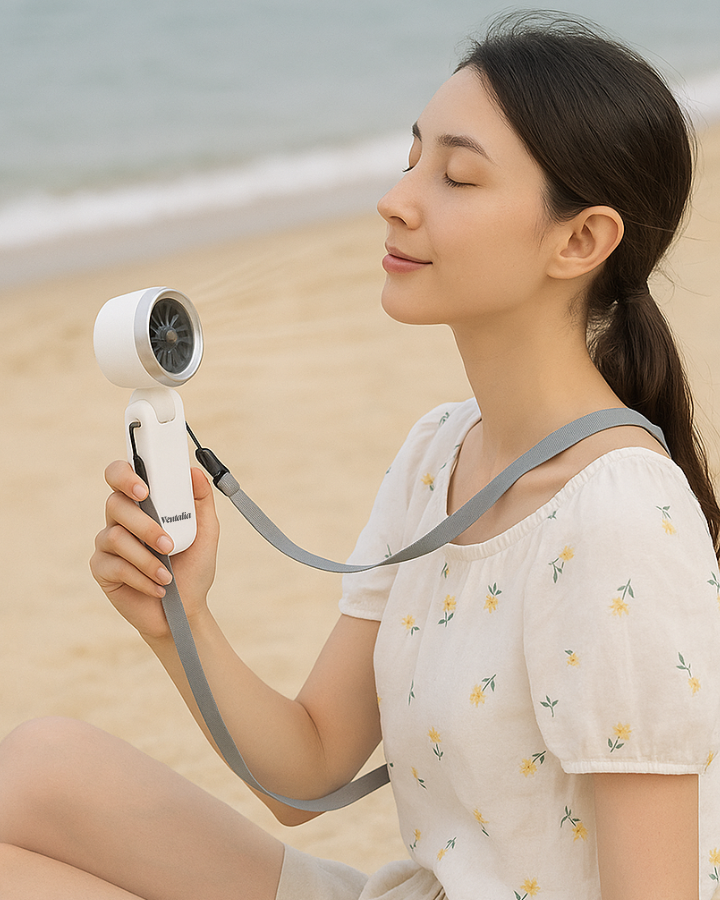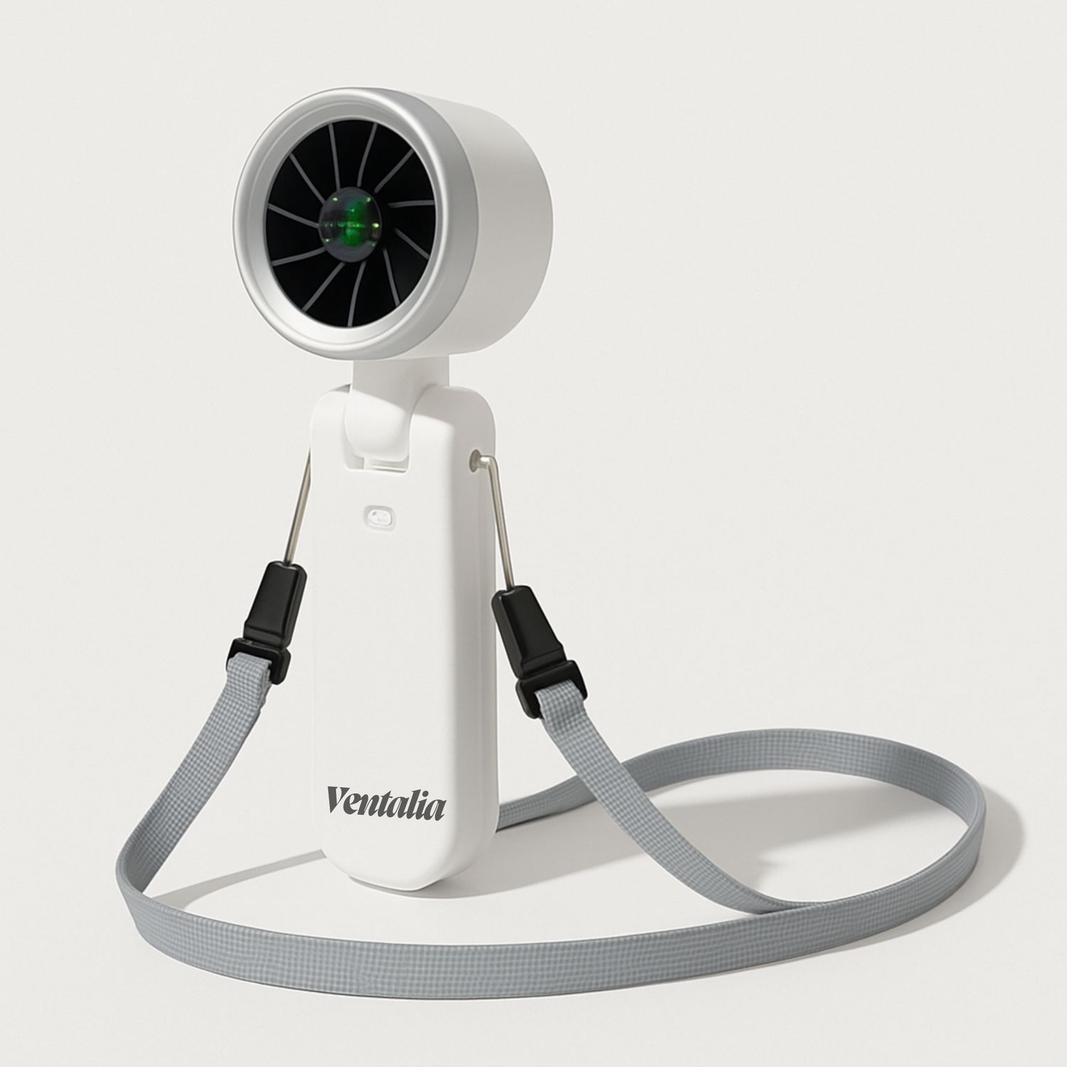 Livré avec une lanière confortable, VENTALIA™ se porte comme un accessoire lifestyle. Finis les bras fatigués : profitez d’un souffle d’air tout en continuant vos activités.